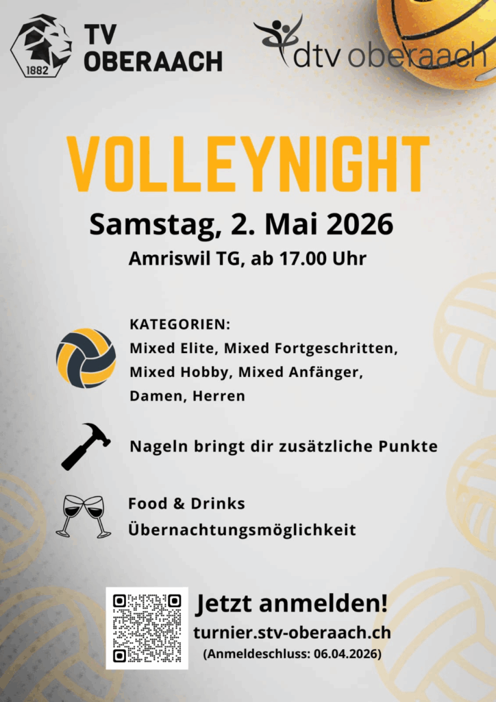 Wir freuen uns auf die Volleynight vom Samstag, 2. Mai 2026 mit Euch! 🎉